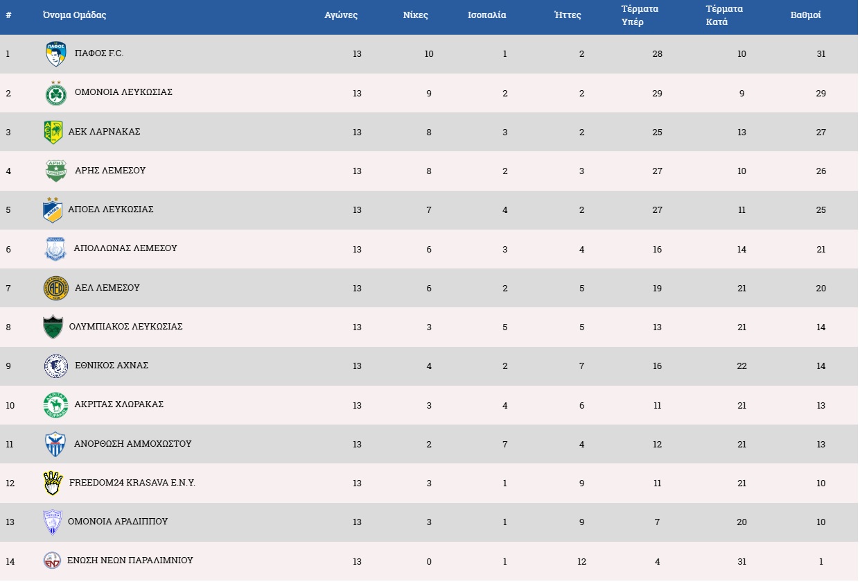 -Η Ομόνοια Λευκωσίας διαθέτει την καλύτερη επίθεση με 29 τέρματα, έναντι 28 της Πάφος F.C.